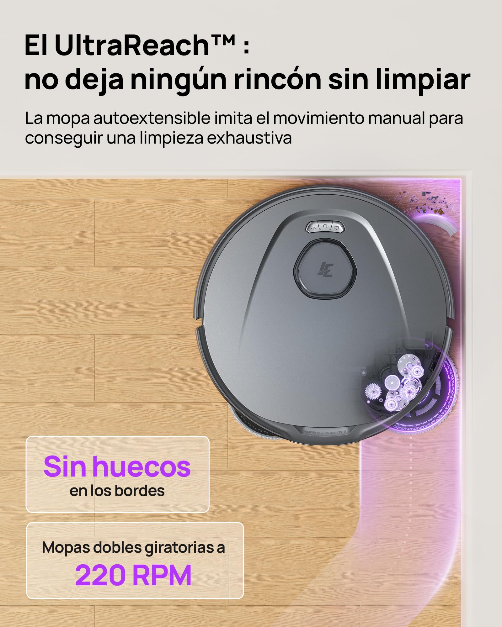 - 【Mopa UltraReach, sin huecos】La mopa con extensión automática se ajusta completamente a los bordes y esquinas, sin dejar ninguna zona sin limpiar. Las mopas dobles, siempre húmedas, giran a 220 RPM, eliminando manchas persistentes con una eficacia similar a la limpieza manual.
