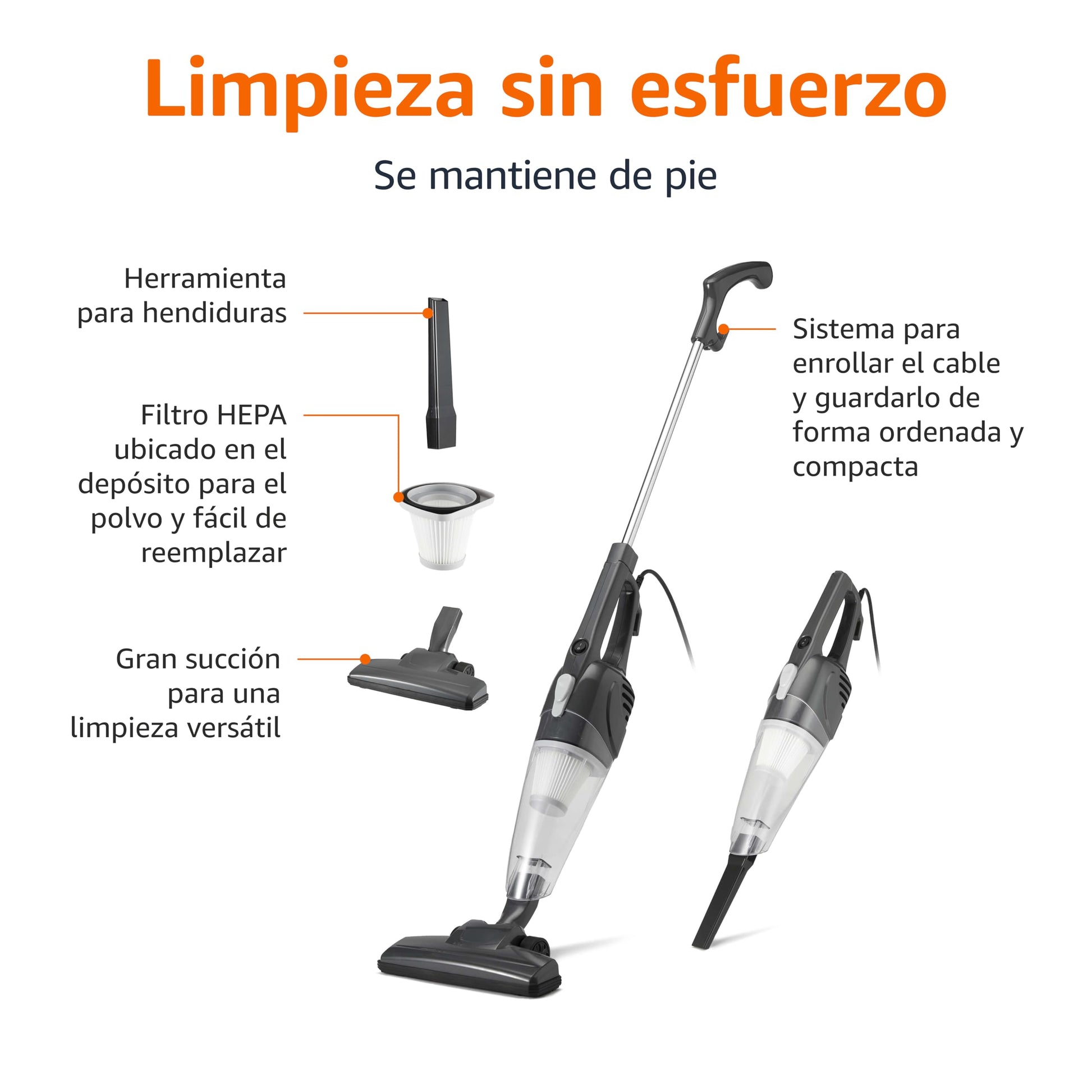 Amazon Basics Aspirador Vertical 2 en 1 con Cable, Motor ECO, Filtro HEPA, Diseño Ligero, Color Negro