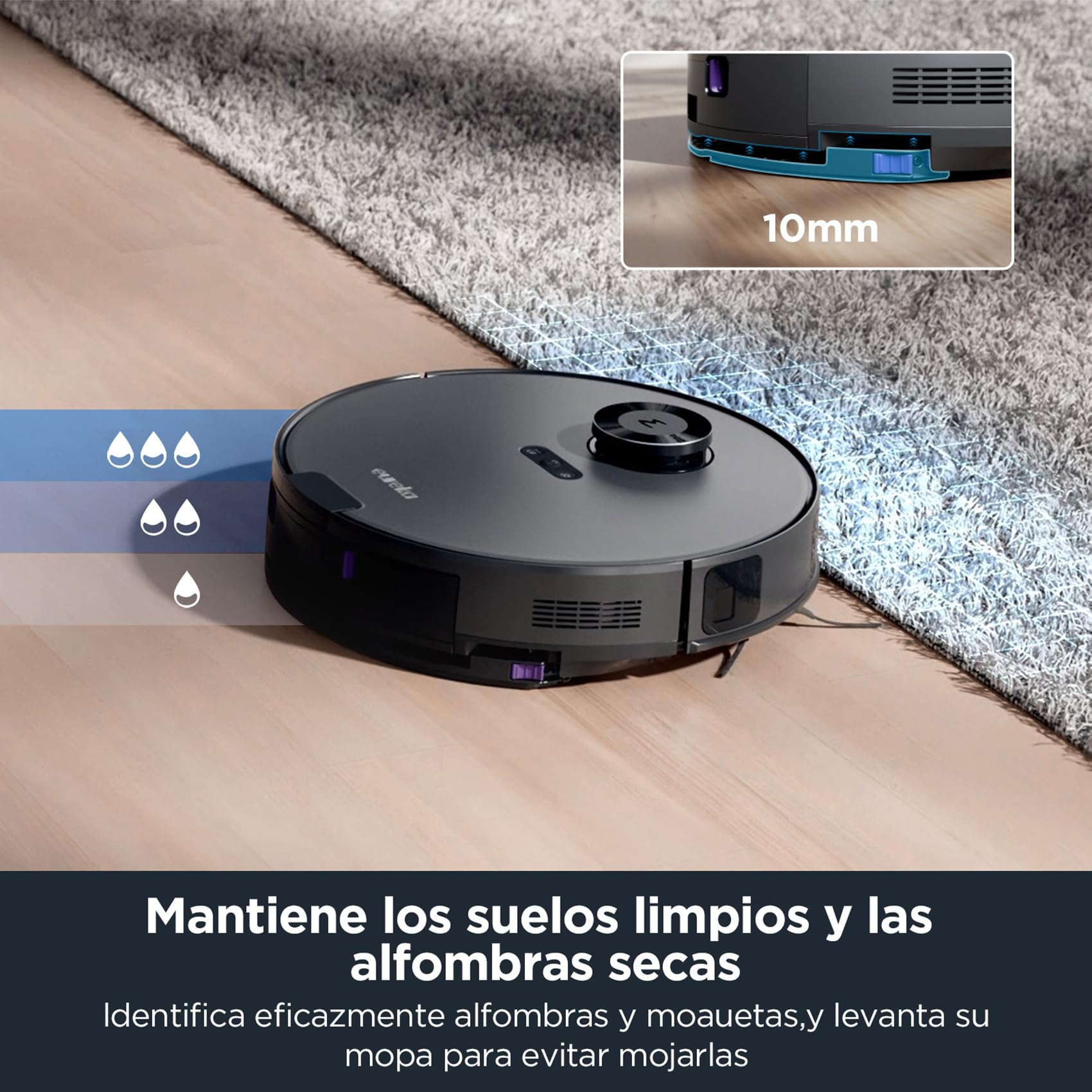 - 【Función inteligente de levantamiento automático de mopa de 10 mm】Nuestro robot aspiradora está equipado con un sistema inteligente que levanta automáticamente la placa de la mopa 10 mm cuando se detecta una alfombra o el dispositivo sale del área de limpieza. Esto evita rasguños y marcas de agua en áreas que no deben limpiarse.