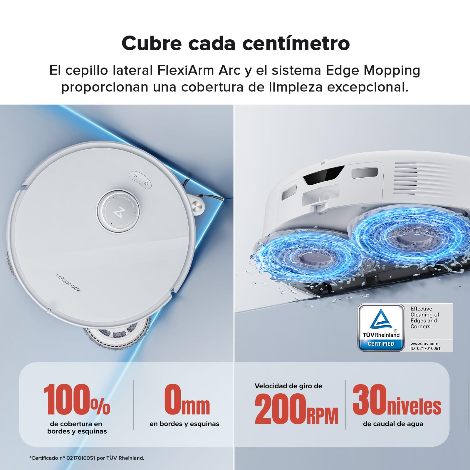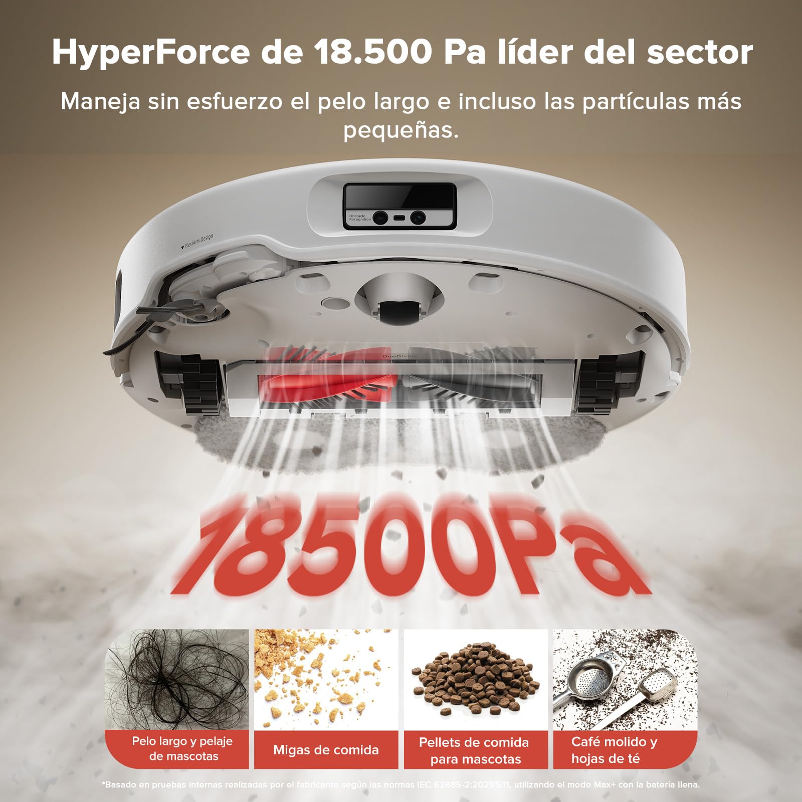 - [ 18,500 Pa de potencia HyperForce, líder en el sector]: La succión HyperForce@ de roborock Qrevo Curv 18 500 FPa, líder en el sector, en combinación con el cepillo de cerdas DuoDivide, se encargan hasta dee las partículas más pequeñas para ofrecer los mejores resultados en las situaciones más exigentes, como las rendijas de los suelos duros o las alfombras y moquetas.