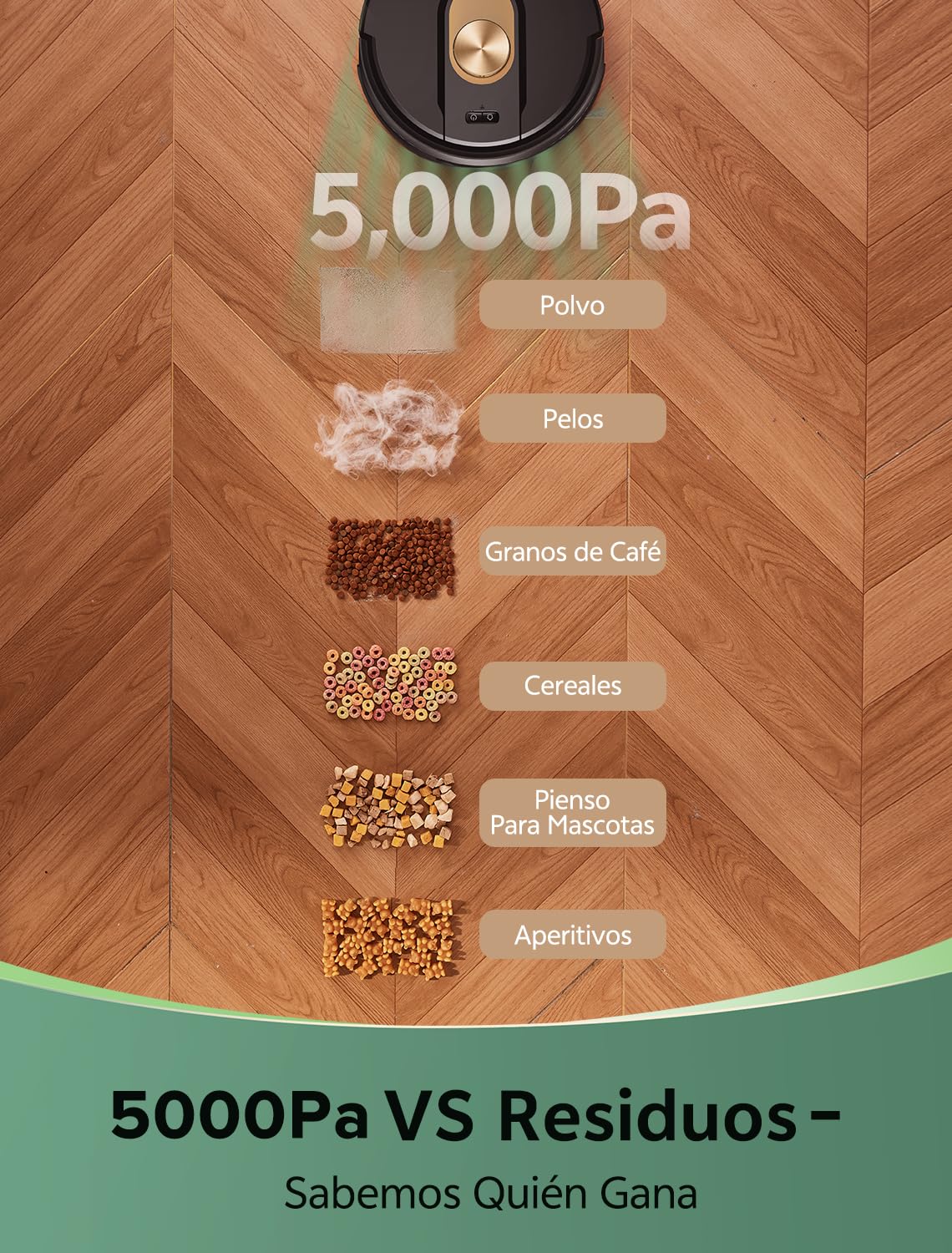 - 【Excelente Aspiración y Fregado】 El robot aspirador y fregasuelos W9 cuenta con una potente succión de 5000Pa, el cepillo lateral y tecnología de detección de alfombras. Al entrar en contacto con alfombras, cambia al modo de limpieza profunda en segundos. Además, incorpora un sistema de fregado húmedo ajustable en tres niveles. Puedes ajustar la salida de agua según tus necesidades, aspirando y fregando simultáneamente, eliminando fácilmente manchas difíciles y pelos a la vez. Este robot aspirador W9 es ideal para familias con mascotas